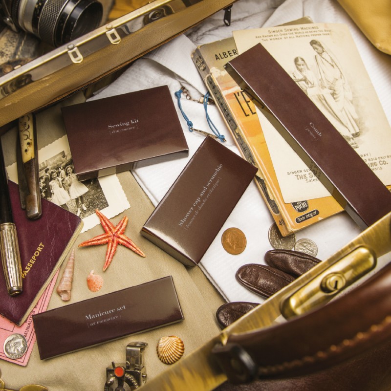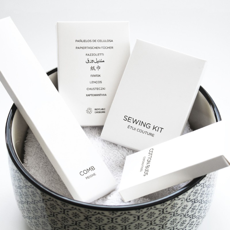 Éponge de bain végétale - Chaussons - Peigne - Brosse à dents - Set dentaire - Mouchoirs en papier - Lime à ongles - Set manucure - Cotons-tiges - Disques à démaquiller - Gant à chaussures - Etui couture